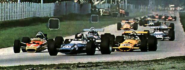 From the left to the right: Jochen Rindt on Lotus 49b-Ford,Jackie Stewart on Matra MS40, behind Piers Courage on Brabham-Ford, and on the right Denny Hulme on McLaren-Ford